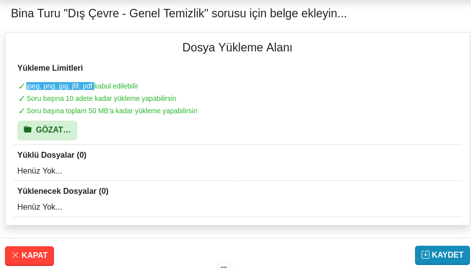 Bina turu yaparken, cevapladığınız sorulara jpeg, png, jpg, jfif gibi resim/fotoğraf dosyaları ya da pdf belgeleri ekleyebilirsiniz...