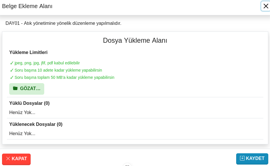 Öz değerlendirme yaparken, cevapladığınız standartlara veya ölçütlere jpeg, png, jpg, jfif gibi resim/fotoğraf dosyaları ya da pdf belgeleri ekleyebilirsiniz...